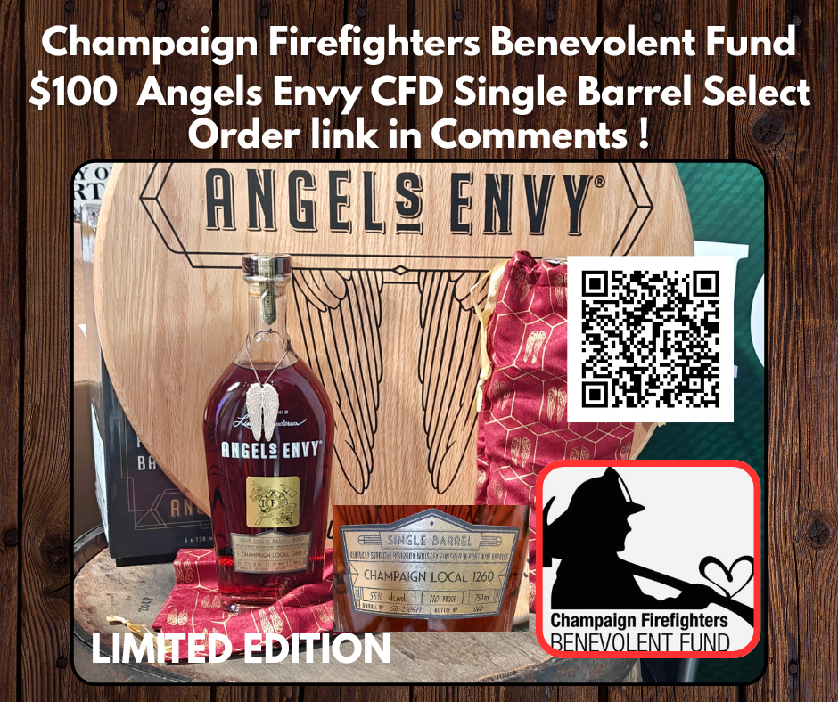 Support the Champaign Firefighters Benevolent Fund with a $100 donation & receive a bottle of Champaign Local 1260 branded Angels Envy Single Barrel Select bourbon. Quantities are limited, so order yours today!